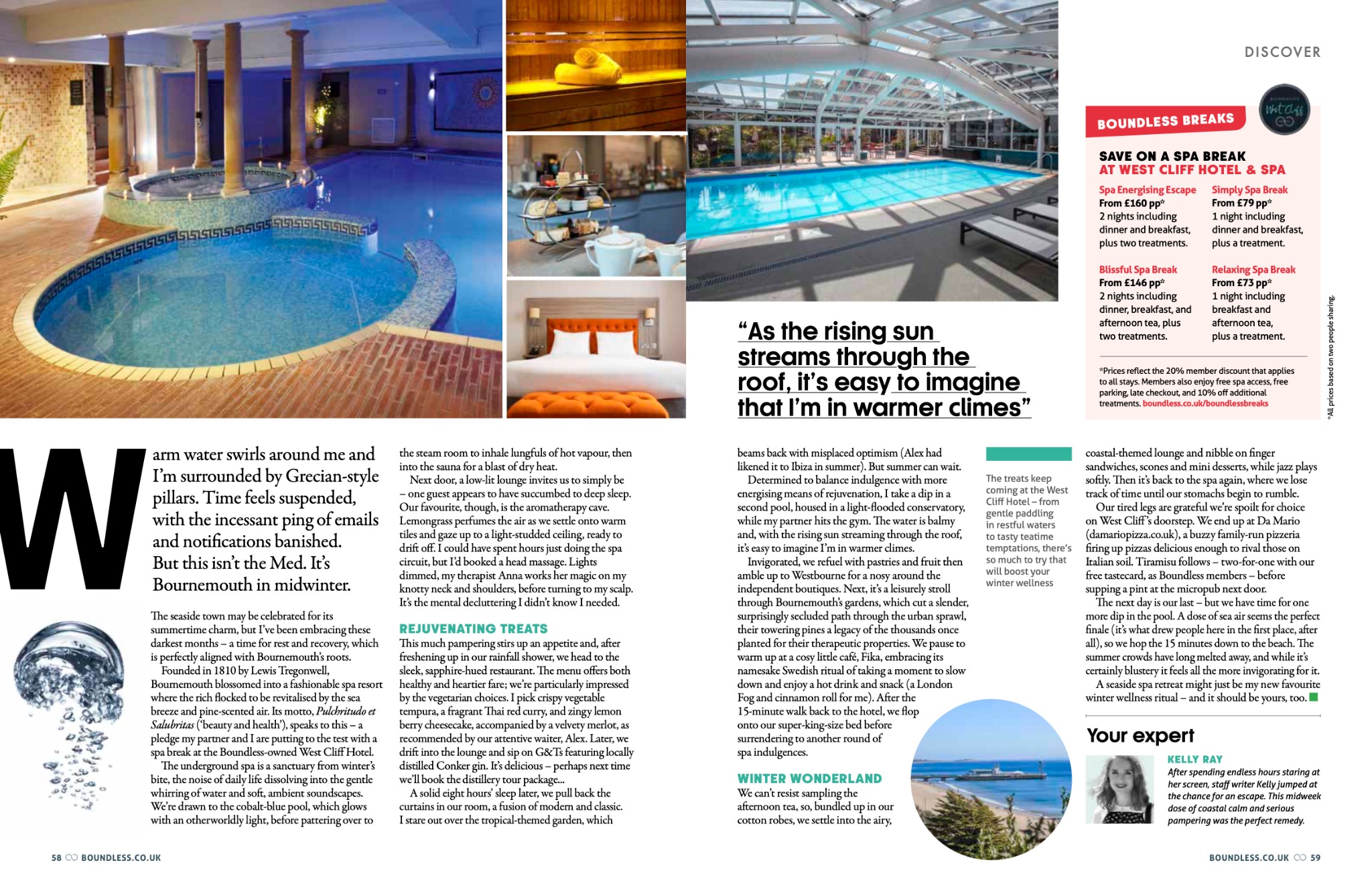 First-person feature on a spa break at the Boundless-owned West Cliff Hotel & Spa, Bournemouth.